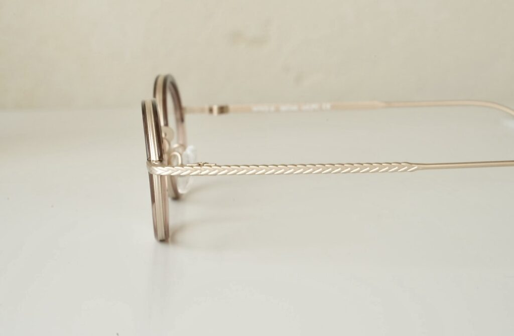 ブリッジとテンプルの三つ編み模様が可愛い、とても小さなメタルフレーム。