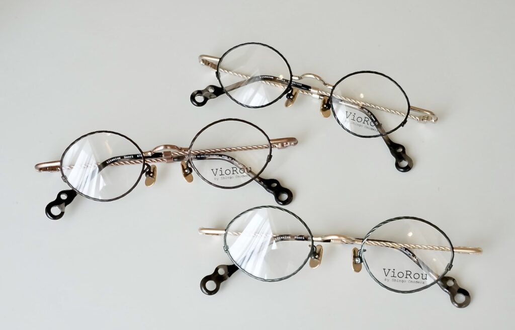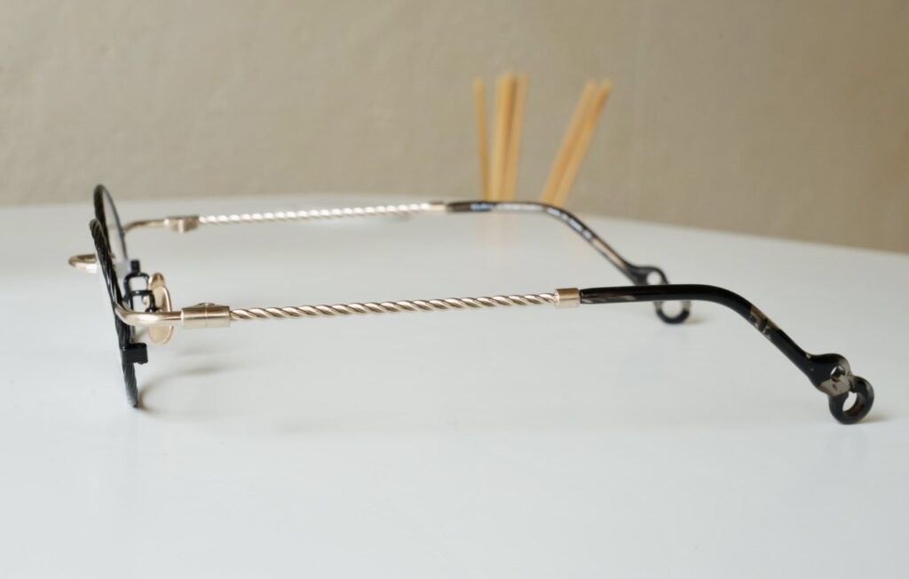 βチタンを編み込んだテンプルは、アクセサリーのような煌めきと、しなやかな掛け心地を実現しています。