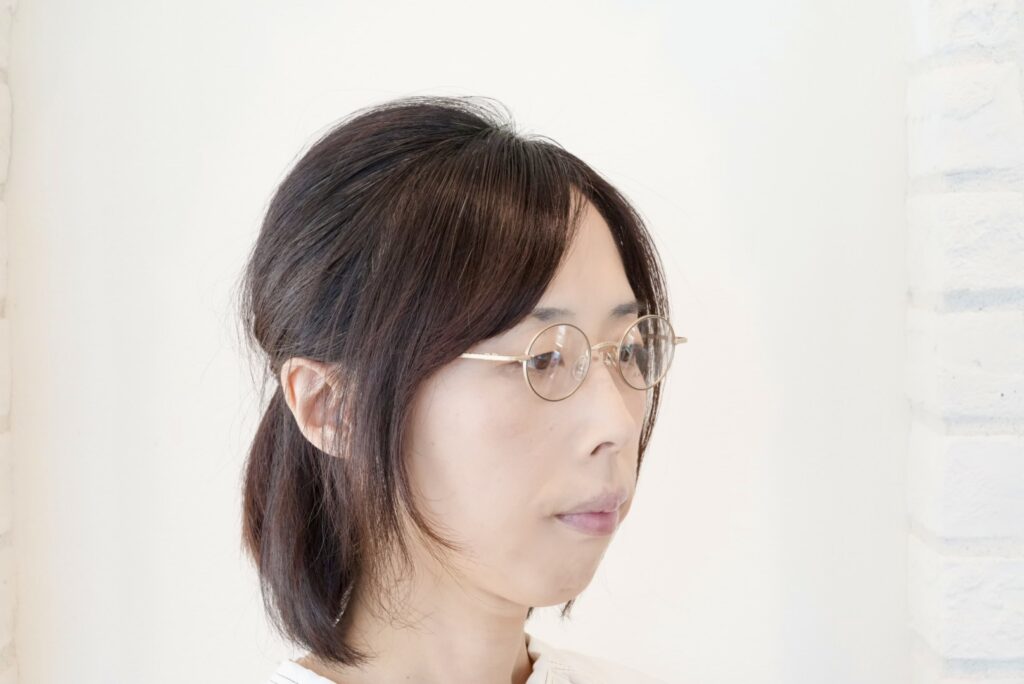 インナーアセテートは鼻側4mm→耳側5mmと厚みを変え、強度近視の方が気になるレンズの厚みを自然に隠してくれる構造になっています。